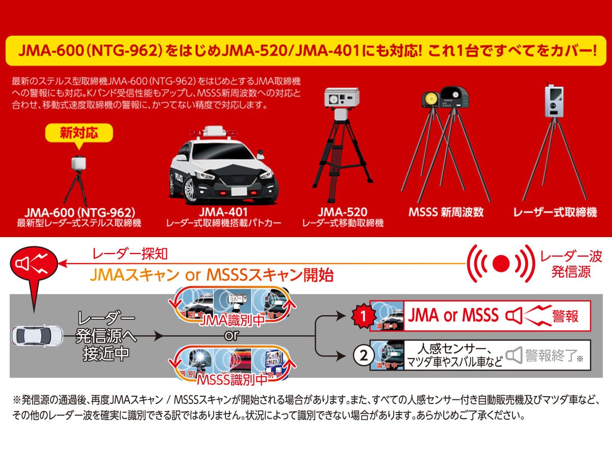 ・新たに稼働が確認されている、ステルス型取締機「JMA-600(NTG-962)」をはじめ、導入が進む最新の移動式オービス「JMA-520」と「JMA-401」(レーダー式取締機搭載パトカー)への警報にも対応。